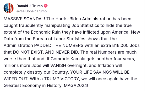 Donald Trump’s Pants on Fire claim that Biden, Harris manipulated job data