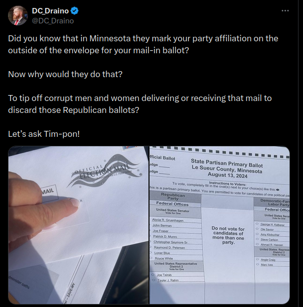 Minnesota Mail-In Ballot Envelopes Do NOT Have Political Party Affiliation On Outside