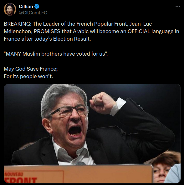 A post viewed 1.8 million times on X (formerly Twitter) claims: “The Leader of the French Popular Front, Jean-Luc Mélenchon, PROMISES that Arabic...