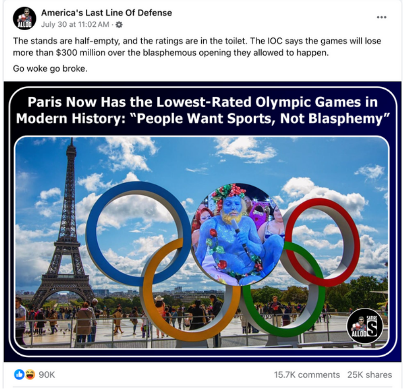 On July 30, 2024, Facebook account America's Last Line of Defense posted a meme claiming the 2024 Paris Olympics were the "lowest-rated" Games in...