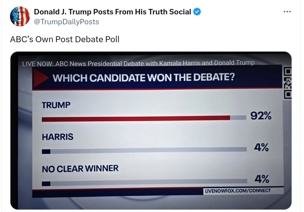 Did ABC compile a post-debate poll showing that 92 percent of respondents believed Donald Trump "won" the September 10, 2024, presidential debate?...