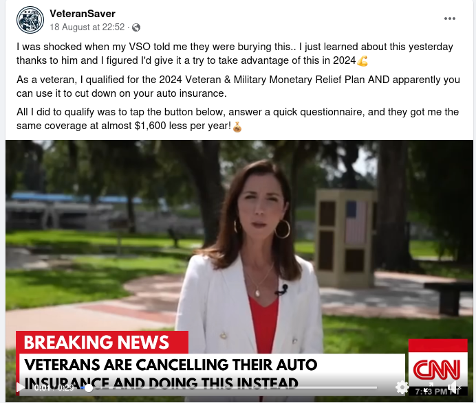 What looks like a CNN breaking news segment about car insurance for veterans is drawing attention on social media, but maybe not the attention the...