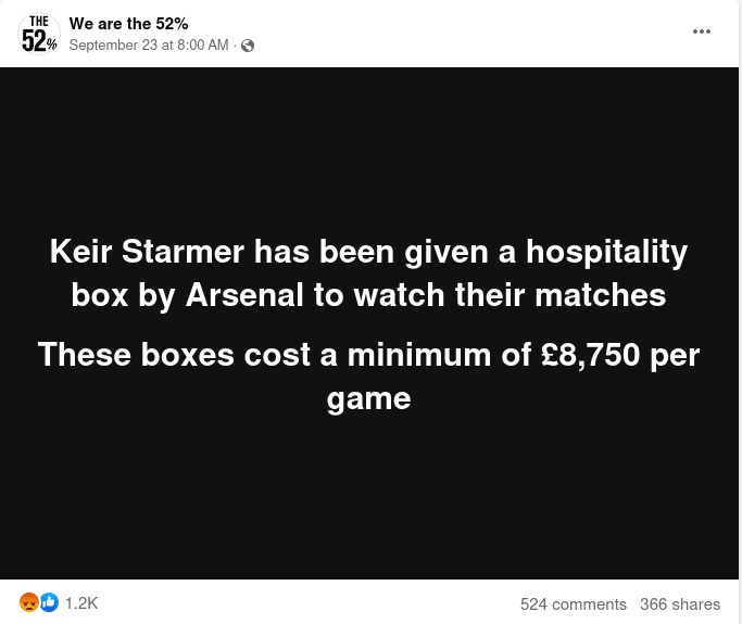 Arsenal Football Club has not gifted Keir Starmer a corporate box to watch its games since he became Britain’s prime minister, contrary to viral...