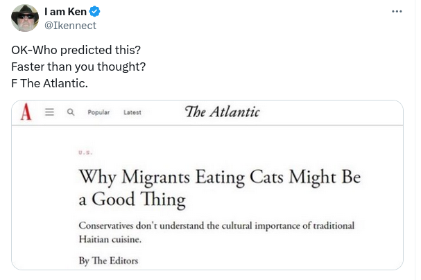 The Atlantic did not publish a headline praising migrants eating cats