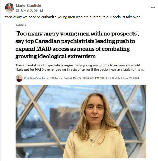 A CBC News article on Canadian psychiatrists pushing medical assistance in dying (MAID) to combat ideological extremism is altered. The headline was..