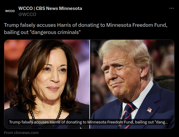 CBS News Minnesota claims that Trump accused Harris of donating to the Minnesota Freedom Fund and bailing out dangerous criminals. It labeled these...
