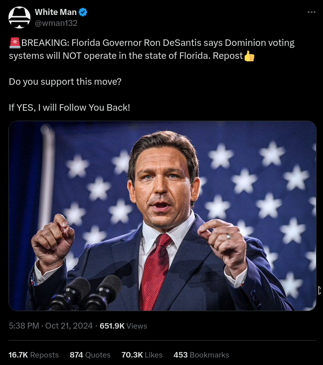 Contrary To Viral X Post, Dominion Voting Systems Will Operate In Florida