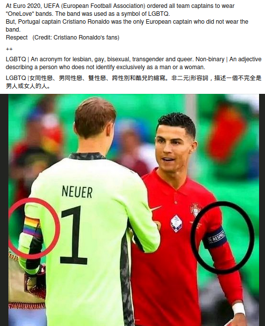 Portuguese footballer Cristiano Ronaldo did not defy a UEFA order by declining to wear an armband in the colours of the LGBTQ flag during Euro...