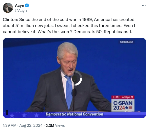 Former U.S. President Bill Clinton claimed during the Democratic National Convention in August 2024 that of the 51 million jobs created in the...