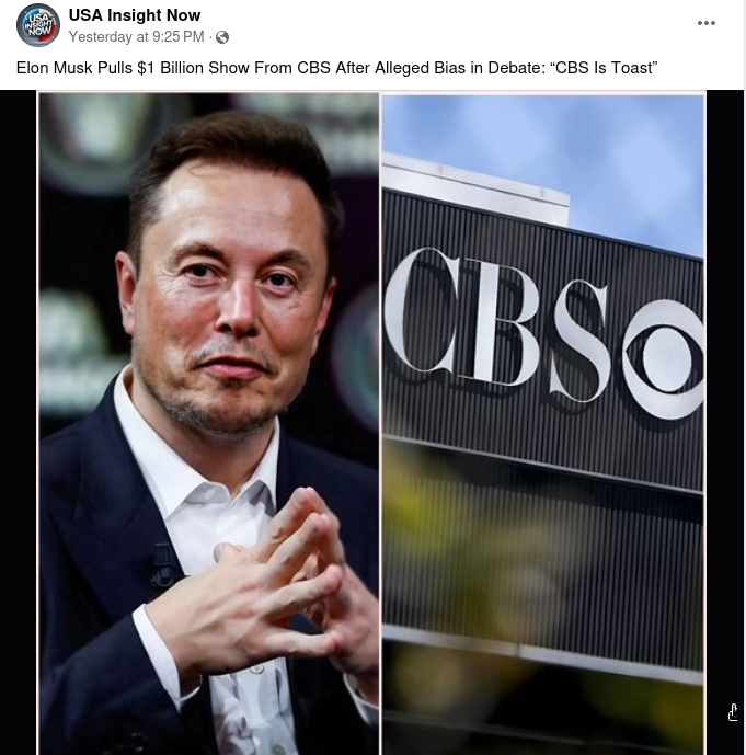 A post made on Facebook claims that Tesla CEO Elon Musk pulled a $1 billion show from broadcasting company CBS. The caption reads, “Elon Musk Pulls...