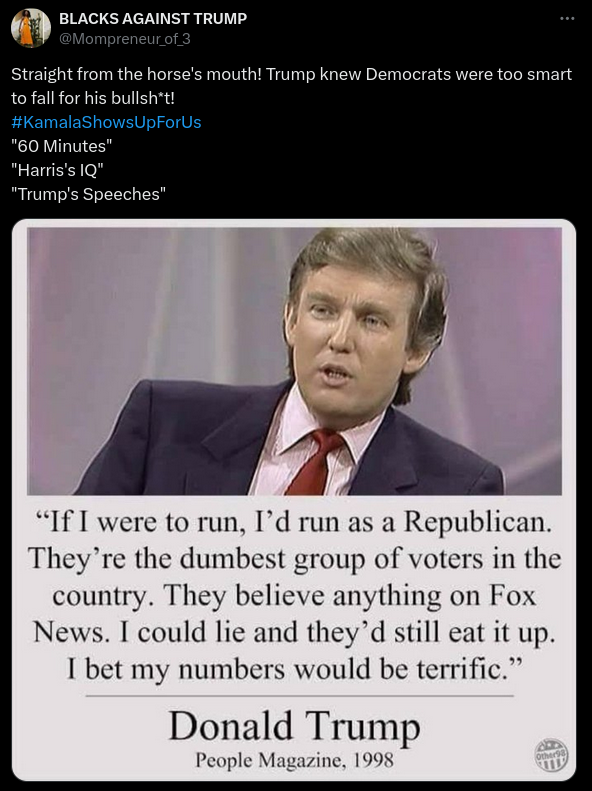 A post made on X claims that Trump spoke ill of Republican voters during a 1998 People magazine interview. The caption reads, “Straight from the...