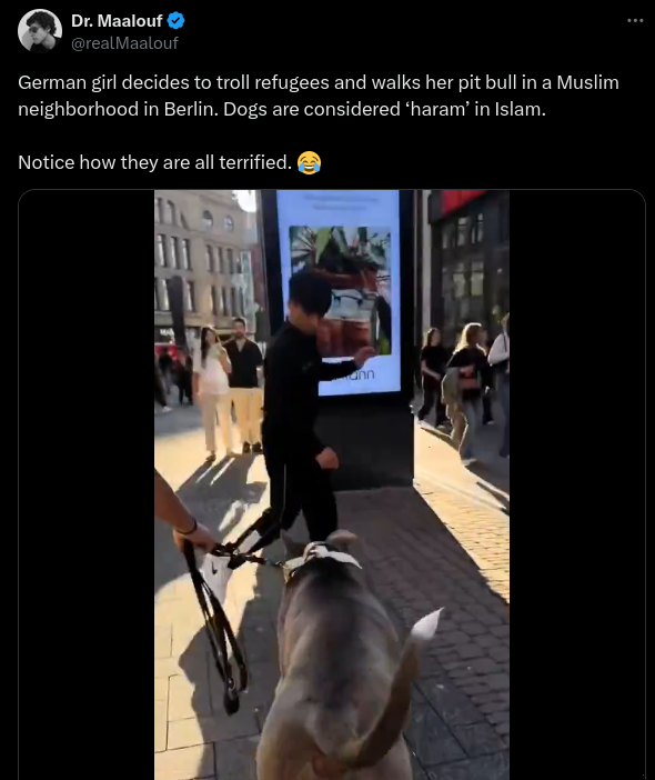 A post made on X claims a German woman purposely walked her pit bull around Berlin to scare Muslim refugees. The caption reads, “German girl...