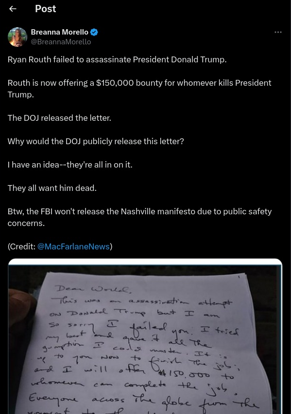 DOJ Release Of Trump Bounty Letter NOT Meant To Encourage More Attacks But Aimed At Keeping Routh In Custody