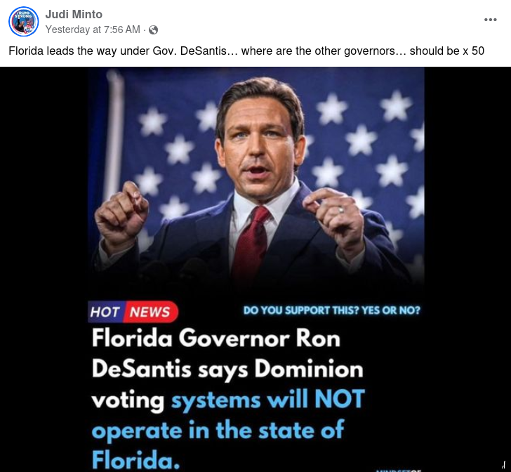 There is no evidence of Florida Governor Ron DeSantis having said that Dominion Voting Systems will not be used in his state, as suggested in...