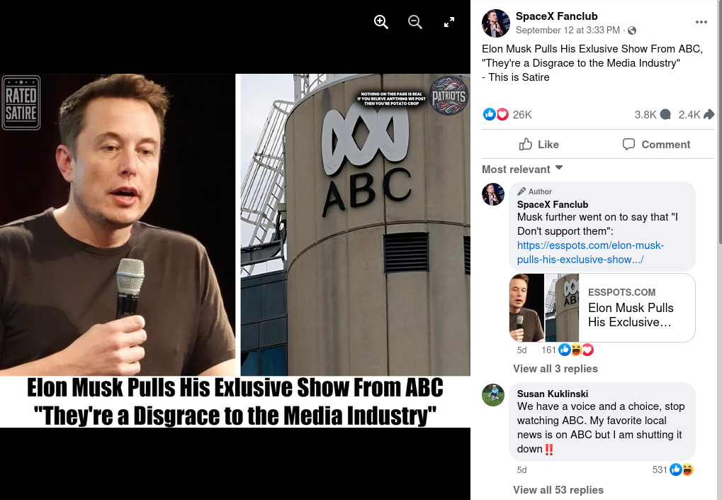 A rumor that Elon Musk pulled an "exclusive show" from ABC was circulating online on Sept. 12, 2024. One Facebook post (archived) said the tech...