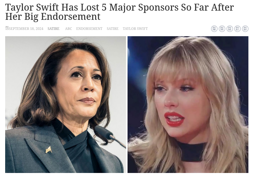 FAKE Article Saying Taylor Swift 'Lost Five Major Sponsors' After Endorsing Kamala Harris From Site That Says 'Nothing On This Website Is Real'