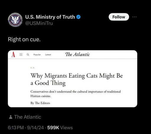 The Atlantic did not publish an article with the headline “Why Migrants Eating Cats Might Be a Good Thing,” as suggested by a fake screenshot...