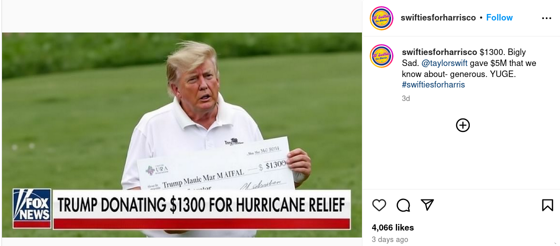 Fake image shows Donald Trump donating $1,300 check to hurricane relief