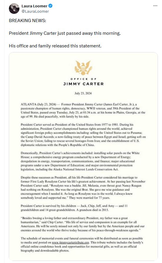 A US senator and the New York Post piled onto an avalanche of social media posts claiming Jimmy Carter died July 23, 2024 after a supposed letter ...