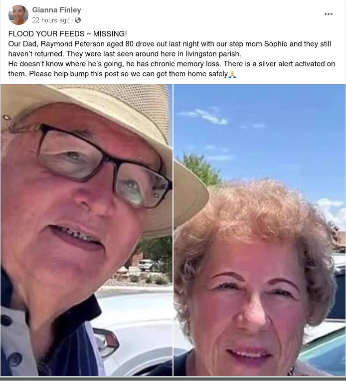 Did social media posts share the true story of the disappearance of Raymond Peterson and his wife Sophie from Livingston Parish in Louisiana?...