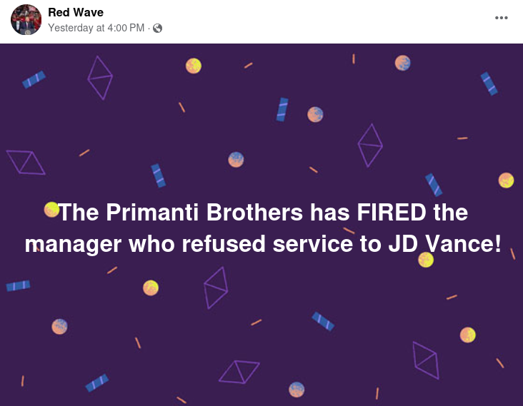 False Story Claims Primanti Bros. Restaurant 'Fired Manager Who Refused Service to JD Vance'