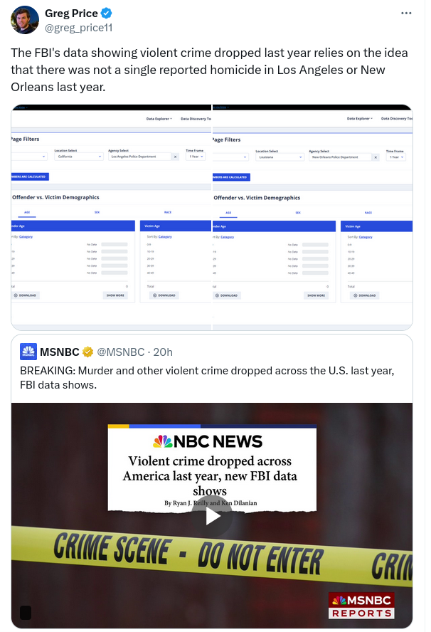 Did FBI crime statistics falsely record no homicides in Los Angeles or New Orleans in 2023? No, that's not true: The FBI's Crime Data Explorer...