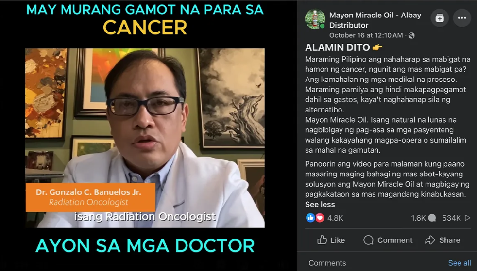 Radiation oncologist Dr. Gonzalo Banuelos Jr. endorses Mayon Miracle Oil, a product that claims to cure cancer...