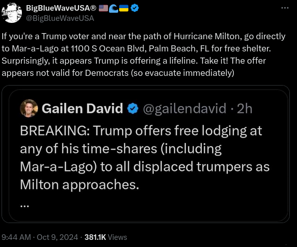 An Oct. 9 X post claims former President Donald Trump is offering a unique form of assistance to supporters affected by a natural disaster...