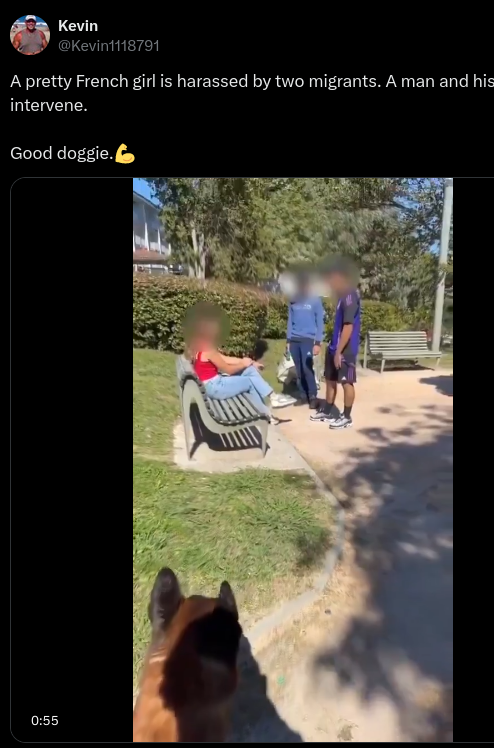 Did a man with a large Alsatian dog rescue a pretty French girl who was being harassed by two migrants? No, that's not true: Disclaimer hashtags...