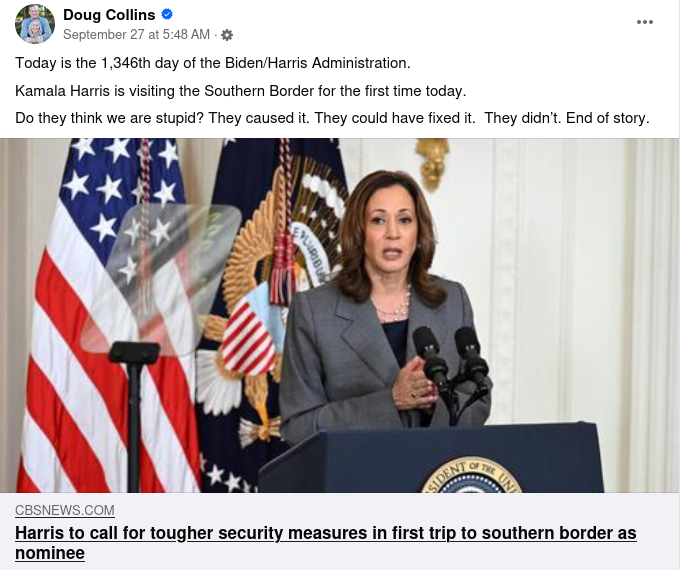 A Sept. 27 Facebook post claims Kamala Harris was vice president for more than three years before she visited the U.S. southern border...