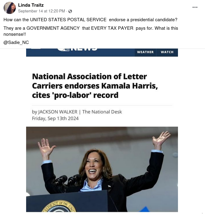 A postal workers union, the National Association of Letter Carriers, endorsed Democratic presidential candidate Kamala Harris ahead of November’s...