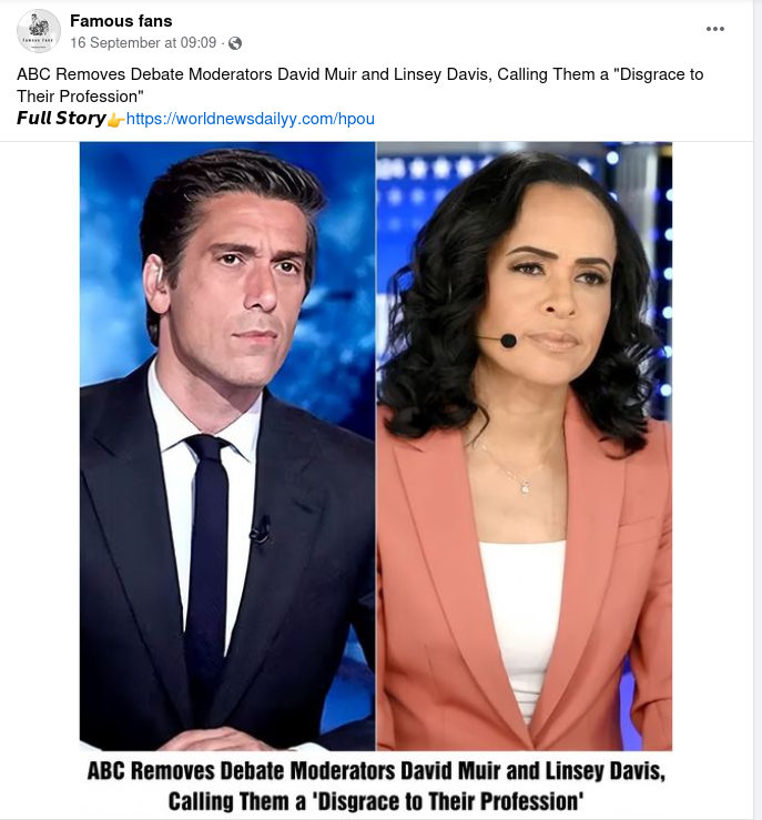 A headline saying that the ABC News anchors who moderated the Sept. 10 presidential debate between Democratic candidate Kamala Harris and her...