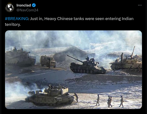 Social media users are claiming to show Chinese tanks in Indian territory. One user wrote,”#BREAKING: Just in, Heavy Chinese tanks were seen...