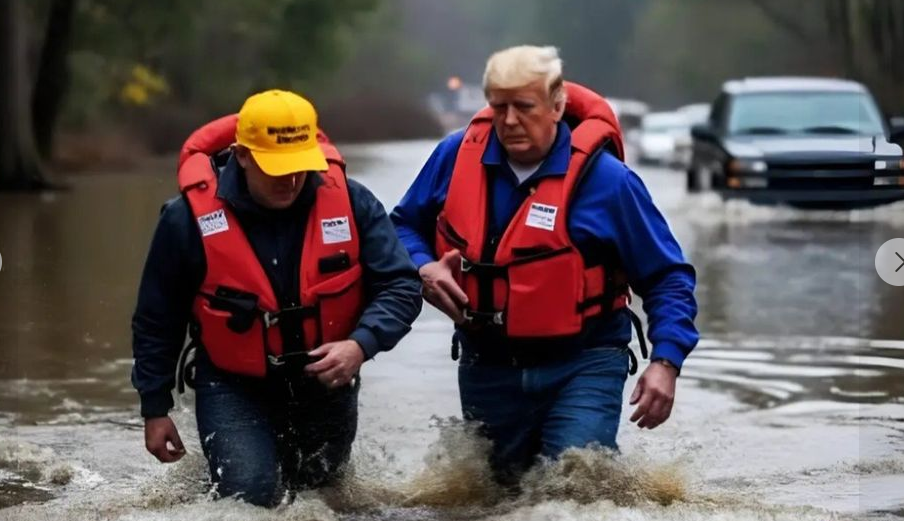 A Sept. 30 Facebook post appears to show former President Donald Trump walking through a flooded street while wearing an orange life...