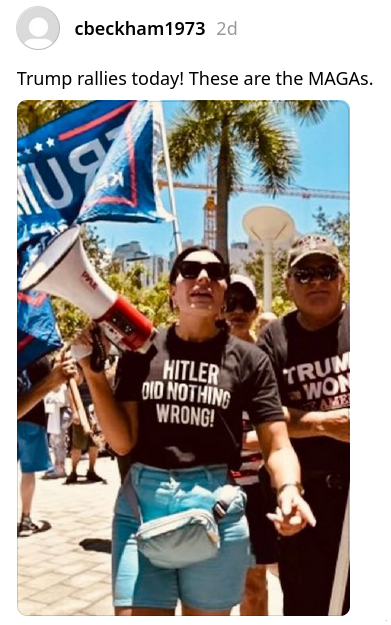 An image circulating online purports to show a member of a group of Donald Trump supporters wearing a T-shirt that said, in all-caps, "Hitler did...