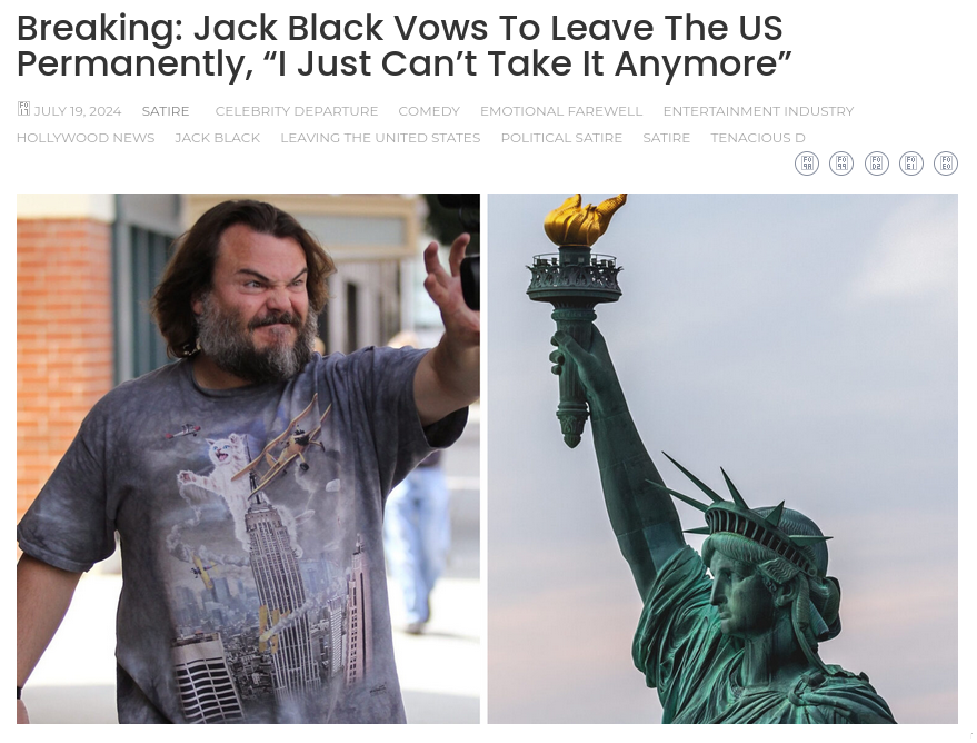 Did actor Jack Black vow to leave the United States permanently? No, that's not true: That comes from a website that specializes in satirical news...