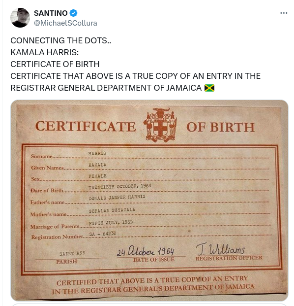 Does a "certificate of birth" supposedly from Jamaica prove that Kamala Harris was not born in the United States, therefore making her ineligible...