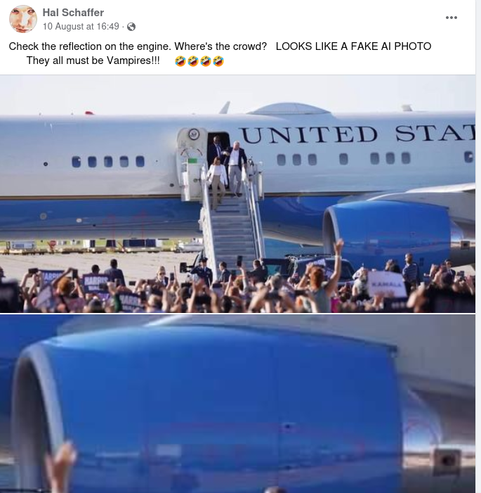 Is an image from a Kamala Harris political rally in Detroit a "FAKE AI PHOTO" because the reflection on the plane's engine and fuselage doesn't...