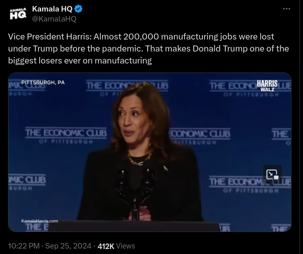 Kamala Harris Falsely Claims Donald Trump Lost 200,000 Manufacturing Jobs Before Pandemic Started