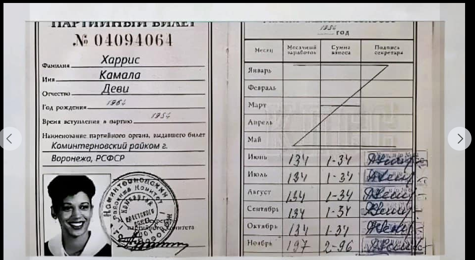 A photo of a Soviet Union Communist Party credential has been altered to portray Vice President Kamala Harris as a member. The purported ID can be...