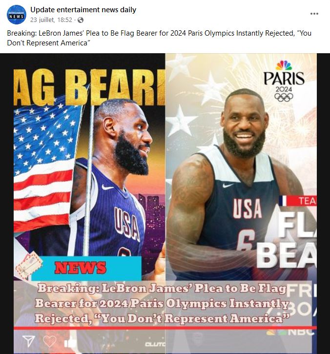 False reports of basketball player LeBron James being rejected as Team USA’s male flag bearer at the 2024 Paris Olympics opening ceremony on July 26..