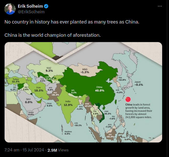 A post shared to X on July 14, 2024, cited a map showing forest growth in Asia to claim "no country in history has ever planted as many trees as...