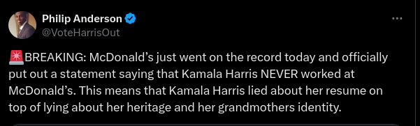 Did McDonald's issue a statement on October 20, 2024, that stated Kamala Harris had never worked at a McDonald's franchise? No, that's not true...
