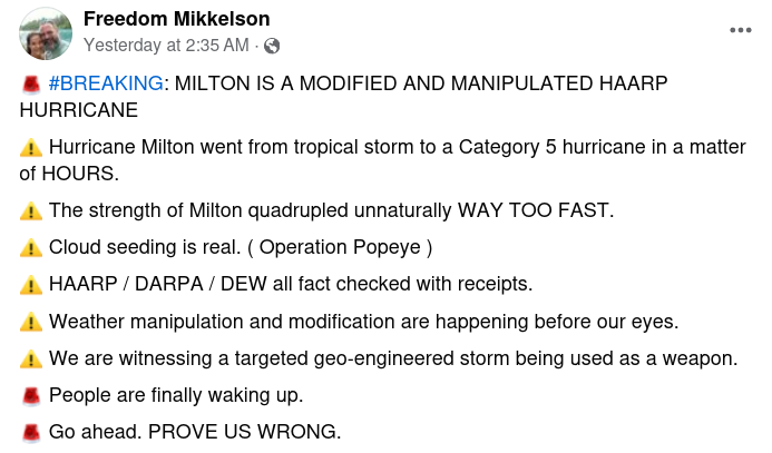As Hurricane Milton barrels across Florida’s Gulf Coast, a torrent of claims about controlled weather and corrupt emergency officials have surged...