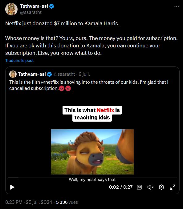 Social media posts call for a boycott of Netflix after false claims circulated of a $7 million donation from the company to Kamala Harris's...