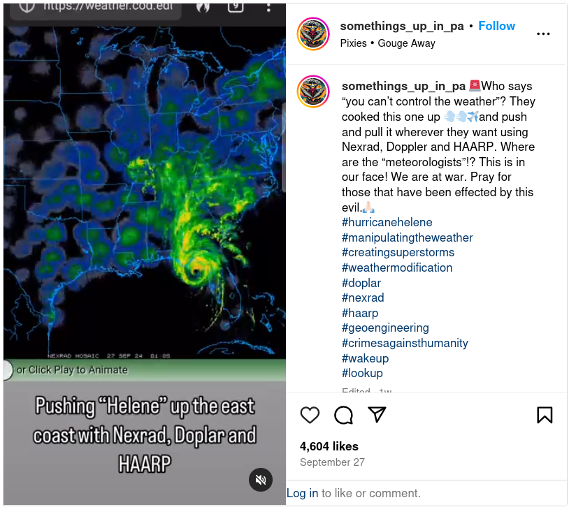 A Sept. 27 Instagram post includes a video of a weather radar map showing a hurricane moving up through Florida into the Southeast U.S. Blue...