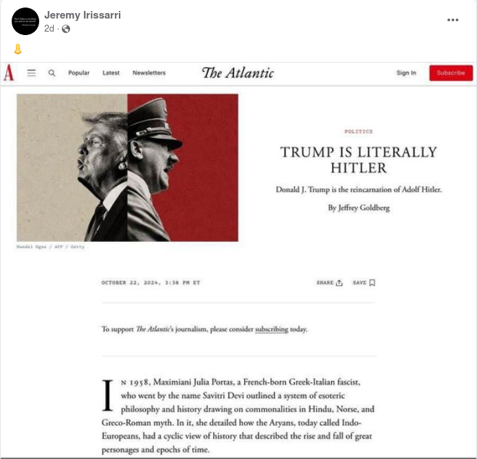 An Oct. 22 Facebook post shows what appears to be an article published by The Atlantic about former President Donald Trump...