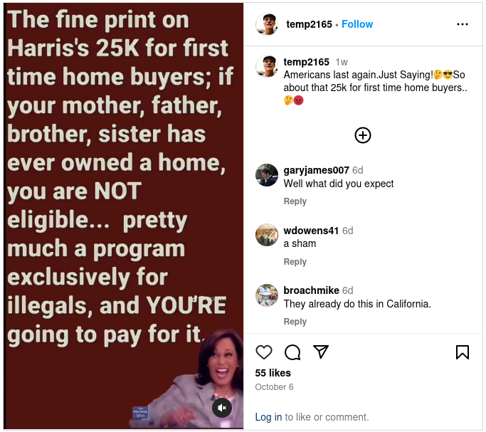 Does the "fine print" on Kamala Harris' plan of $25,000 for first-time homeowners say a person is not eligible if they have a relative who has ever...