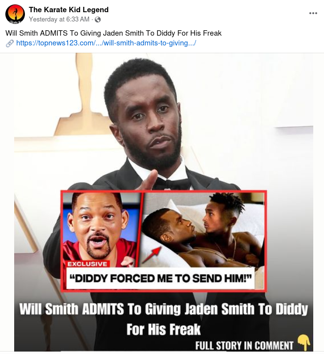 Did Will Smith admit to "giving" his son Jaden Smith to Sean "Diddy" Combs for his "freak offs" parties? No, that's not true: There is no evidence...