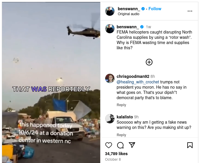 No, a FEMA helicopter didn’t deliberately blow away hurricane relief supplies in North Carolina